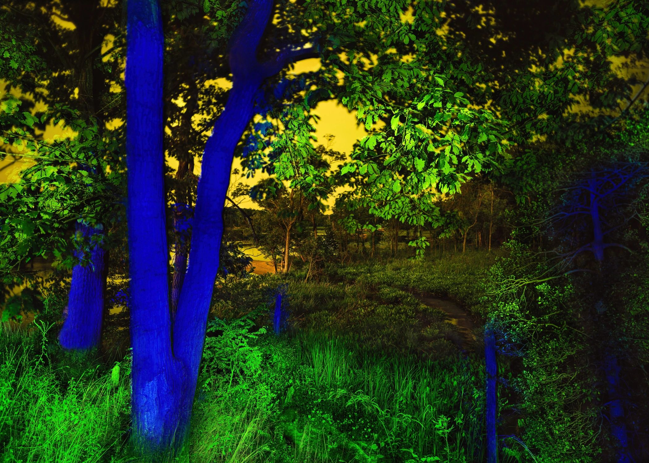 Later, as the sun was setting, I would carry my backpack, filled with 90 lbs. of large-format photographic equipment, to the exact coordinates and prepare for my all-night shoot. What began as an adventure gradually transposed into an earnest study of the lives of the forest trees. All photographs were made in complete darkness with a wide variety of filters and light sources. I began to challenge myself by creating a week's worth of night shoots on a single piece of 5x7 sheet film. In 2002, I expanded my objectives to create images based on up to fourteen nights of shooting on only one sheet of film. The complexity of these images challenged me to the point where I felt that I had reached my maximum capacity for performance in this endeavor.